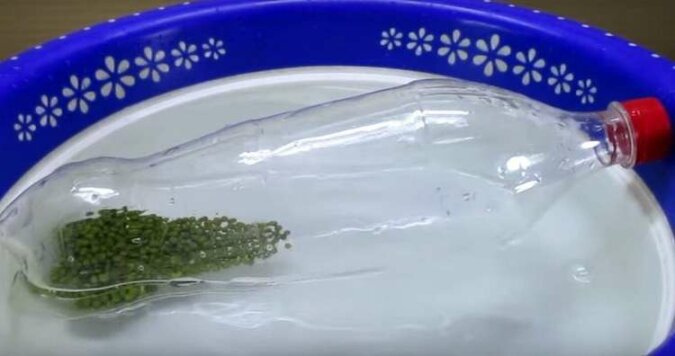 8. Pierwszego dnia nasiona należy 2-3 razy „podlać”. Aby to zrobić, zanurz butelkę w pojemniku z ciepłą wodą na 5 minut, a następnie wyjmij i przekręć, aby pozbyć się nadmiaru wilgoci, i odłóż ją z powrotem w ciemne miejsce.