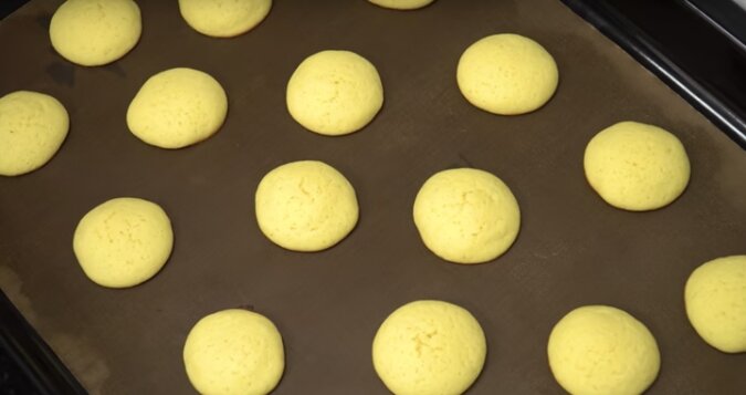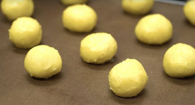 Wyłóż blachę do pieczenia pergaminem. Nasmaruj ręce olejem roślinnym, wywałkuj kulkę z ciasta, umieść w pewnej odległości od siebie.