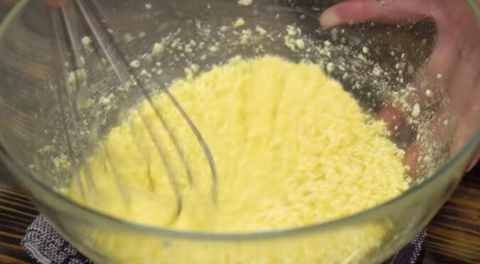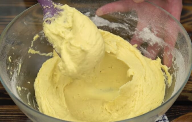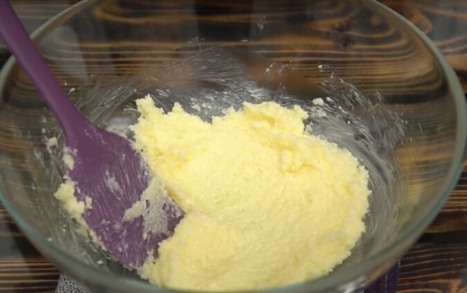 Osobno wymieszaj mąkę z proszkiem do pieczenia, przesiej do masy. Zagnieć ciasto. Przykryj folią, wstaw do lodówki na godzinę lub dwie.