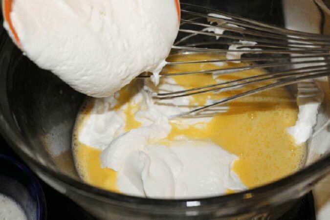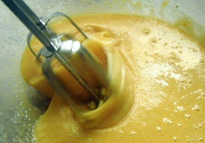 Ubij jajka z cukrem. Masa powinna się rozjaśnić, a cukier powinien całkowicie się rozpuścić.
