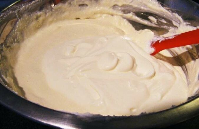 Do jajek dodaj śmietanę, twarożek, roztopione masło, sodę i sól.