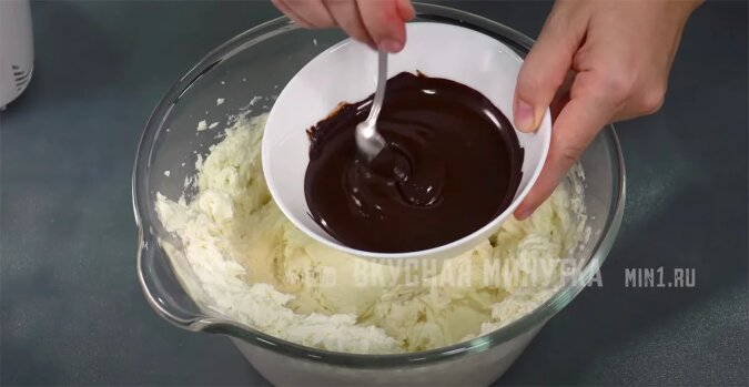 Dodaję cukier, mąkę i cukier waniliowy. Ubijam blenderem przy niskiej prędkości. Następnie dodaję rozpuszczoną czekoladę (nie gorącą!). I ponownie mieszam.