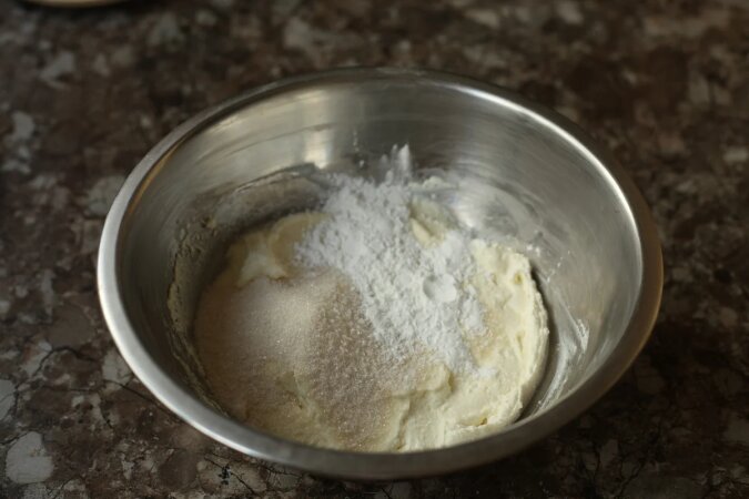 Następnie włóż schłodzone masło, pokrój je na kawałki i rozkrusz rękoma. Robimy wszystko szybko, aby masło nie stopiło się pod wpływem ciepła naszych dłoni. Okruchy są gotowe, na razie odkładamy je na bok.