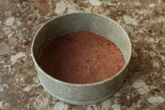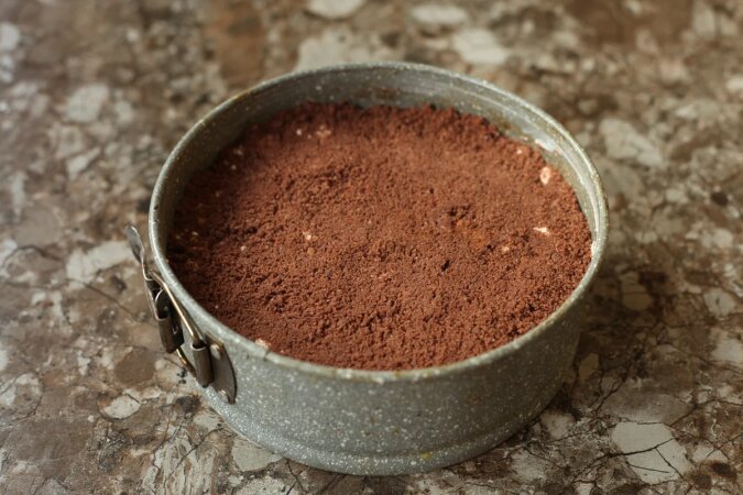 Teraz bierzemy naczynie do pieczenia - najlepiej aby było rozsuwane (rozmiar mojej formy do pieczenia to 18 cm). Przykryj spód foremki pergaminem - ułatwi to wyjęcie ciasta z foremki. Wsyp 1/4 okruchów i lekko ubij łyżką.