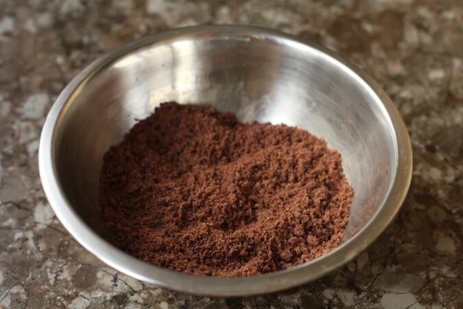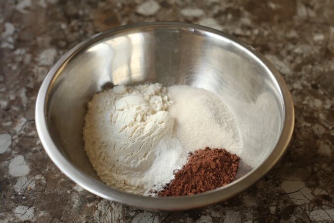 Najpierw przygotujmy okruchy. Mąkę przesiej do miski, dodaj kakao, cukier, wanilię i proszek do pieczenia. Wszystko wymieszaj zwykłą łyżką lub trzepaczką.
