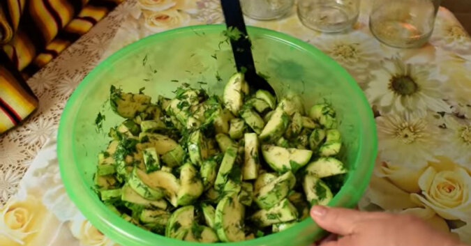 Drobno posiekaj zielenie i pokrój ostrą paprykę w cienkie pierścienie. Dodaj ich do cukinii. Delikatnie wymieszaj produkty. Pozostaw ich na 3 godziny. W międzyczasie spłucz słoiki.