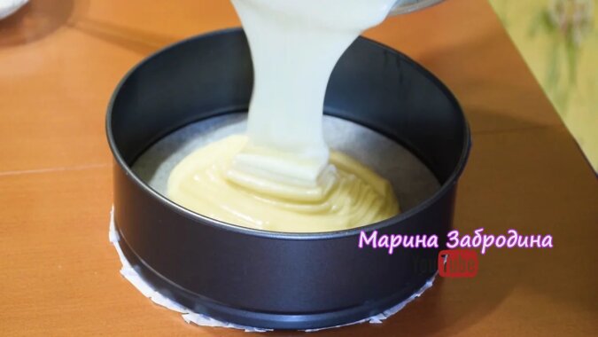 5. Do pieczenia bierzemy formę z bokami. Mam okrągłą (20 cm średnicy). Aby ciasto nie przylgnęło do formy podczas pieczenia, smarujemy dno i boki olejem roślinnym (wystarczy 1 łyżki stołowej). Wlewamy ciasto: konsystencja okazuje się płynna i one się rozprzestrzenia.