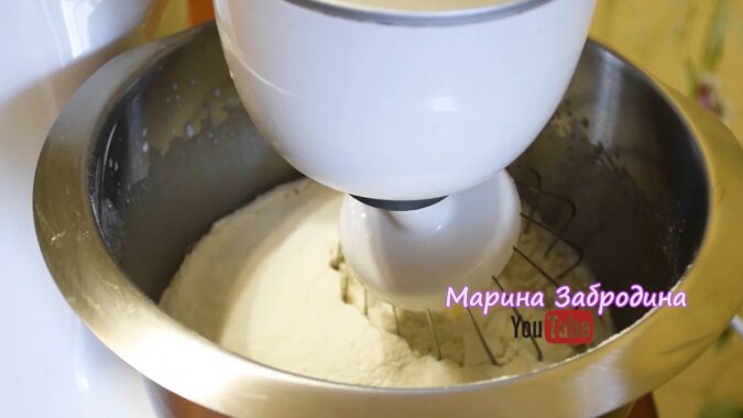 4. Do tego wszystkiego przesiewamy mieszaninę mąki i proszku do pieczenia i wyrabiamy ciasto. Za pomocą łopatki, łyżki, trzepaczki lub przy minimalnej prędkości miksera szybko wyrabiamy ciasto. Gdy już nie będzie suchych kawałków, wtedy trzeba skończyć wyrabiać, aby w gotowej formie ciasto zadowoliło cię swoją bujnością.
