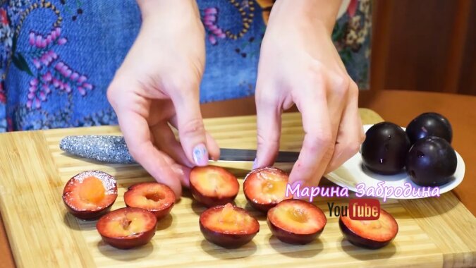 6. Włączamy piekarnik i rozgrzewamy do 170 stopni. Myjemy i suszymy śliwki. Przecinamy każdą śliwkę wzdłuż kości na pół.