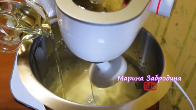 2. Zaczynamy ubijać mikserem kurcze jaja przy średniej prędkości. Będziemy bić 2 minuty, a następnie wlewamy kefir i cienką strużkę wlewamy olej roślinny. Dodajemy szczyptę soli i dodajemy sok z cytryny.