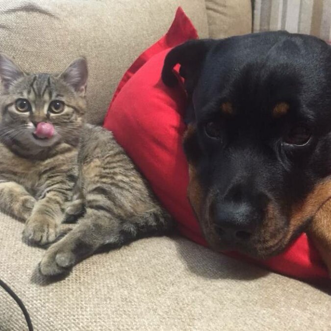 Kilka miesięcy temu psy jak zwykle spacerowały i nagle znalazły w krzakach jakąś zdobycz. Natychmiast się zdenerwowały i zaczęły pędzić do domu. Właściciel zauważył, że coś wystaje z pyska rottweilera, podczas gdy pies wyraźnie ukrywał swoje znalezisko. Mężczyzna zmusił psa do pokazania zdobyczy, a kiedy to zobaczył oniemiał. W zębach ogromnego psa był mały kotek, wciąż zupełnie ślepy i bardzo chudy. Młody człowiek wziął maleństwo w ramiona i zaniósł do domu. Psy biegły obok i ciągle patrzyły na kociaka, jakby się o niego martwiły.