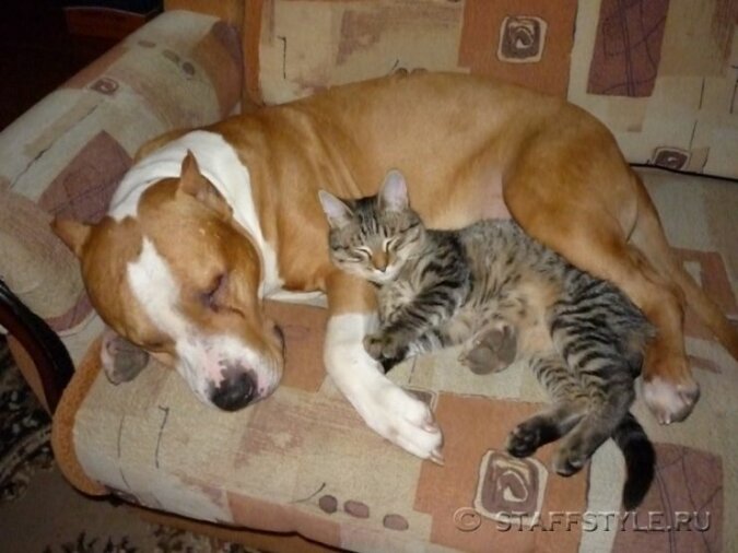Kot został nakarmiony i wyraźnie urósł po jakimś czasie, a psy zamieniły się w dwóch troskliwych, szalonych tatusiów. Śpią na zmianę z kotkiem, pozwalając maleństwu po nich się turlać. Jeśli kotek gdzieś idzie, psy podążają za nim, nie zostawiając go samego. Psy wychodzą na spacer tylko po to, by wyjść z konieczności i natychmiast pędzą do domu.
