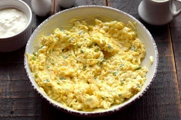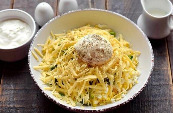 To obfite i fajne ciasto nie wymaga żadnych specjalnych umiejętności gotowania. Najpierw musisz zrobić nadzienie. Jajka ugotuj na twardo, ostudź w zimnej wodzie, obierz i zetrzyj na tarce. Również zetrzyj ser i posiekaj szczypiorek nożem. Połącz wszystkie te składniki i dodaj śmietanę z przyprawami i solą. Wszystko dobrze wymieszaj, aby uzyskać jednorodną masę.