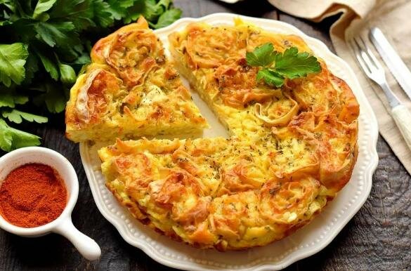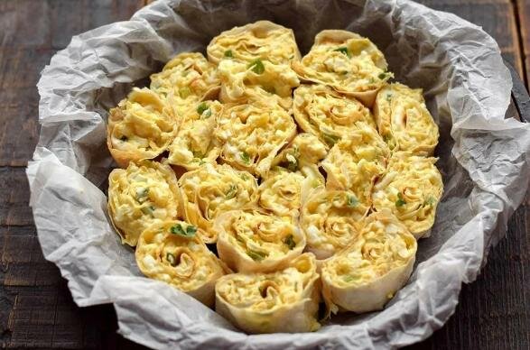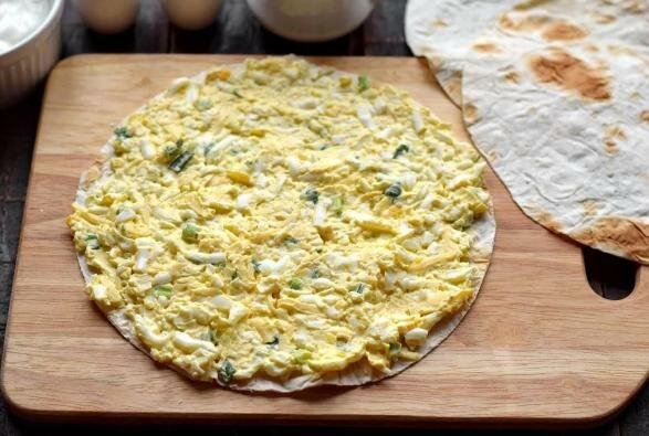 Do przygotowania potrzebujesz pięciu jajek, trzech warstw lawaszu, 120-130 g twardego sera, 100 ml śmietany, około 30 g szczypiorku (kilka sztuk), a także sól i przyprawy do smaku.