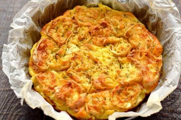 Wstaw formę do piekarnika nagrzanego do 180 stopni na 25 minut. W tym czasie ciasto pięknie się zarumieni, stanie się puszyste, miękkie i jako jedna całość (kawałki zostaną usztywnione przez sos podczas pieczenia). Na zewnątrz będzie przypominał nadziewane jadalne róże.