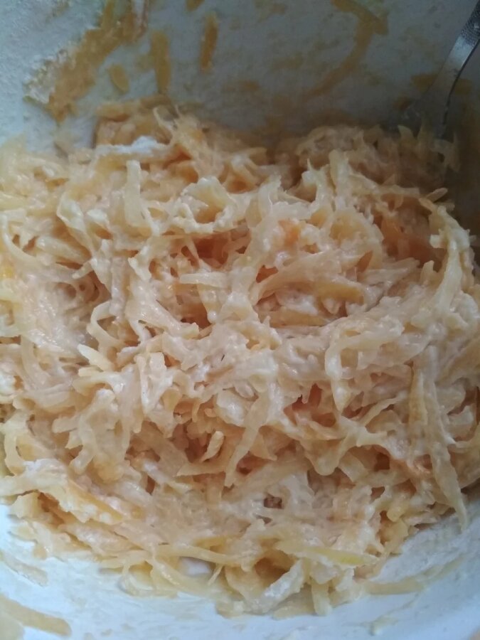 Jak widać, mąki nie ma zbyt dużo, więc widać startą dynię. Placki piekę na oleju na rozgrzanej na patelni. Piekę z obu stron na złoty kolor.