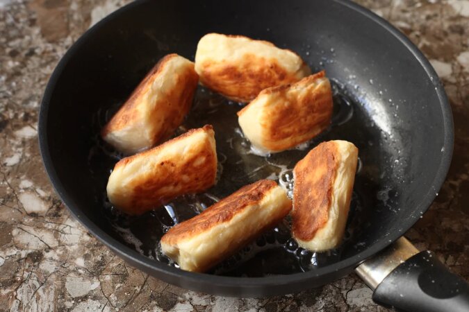 Na patelnię wlej 3-4 łyżki oleju, podgrzej i ułóż kilka uformowanych twarożników. Smaż na średnim ogniu przez 2 minuty z każdej z trzech stron, na złoty kolor. W tej wersji twaróg nie jest zbyt słodki, więc w razie potrzeby posyp go cukrem pudrem. Wypieki są przewiewne, delikatne i chrupiące - to idealne śniadanie dla całej rodziny. Gotuj, próbuj, smacznego!