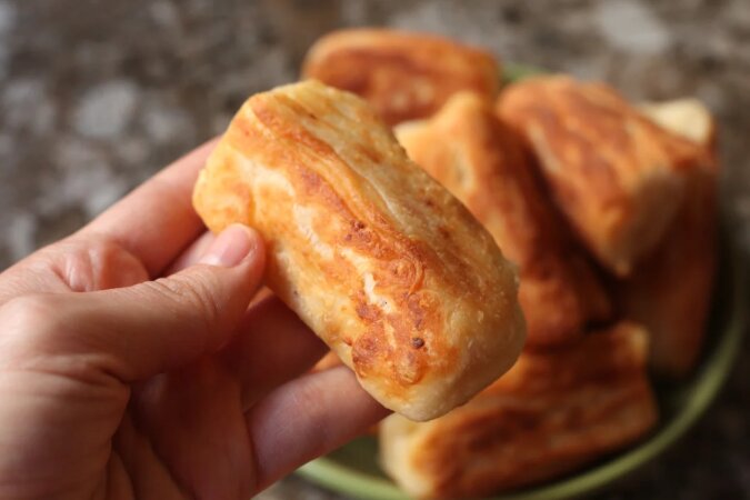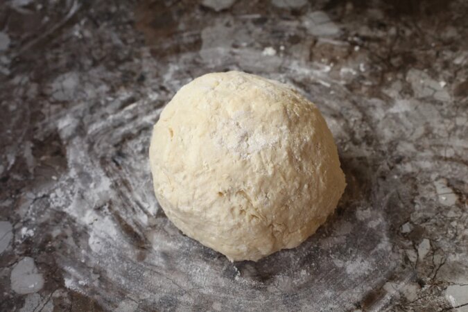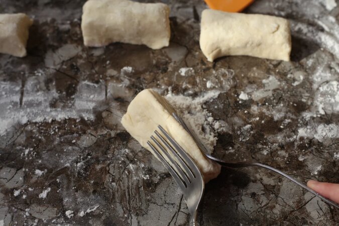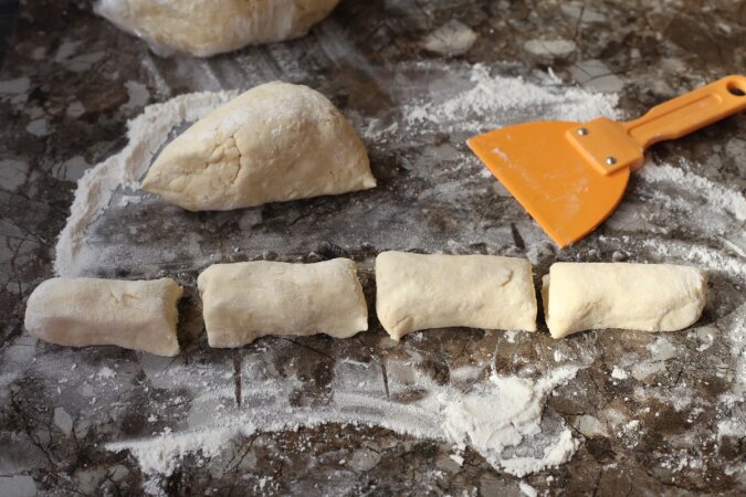 Teraz ciasto dzielimy na kilka części dla wygody dalszej pracy. Część, która nie była jeszcze używana do formowania, zakryj folią, aby powierzchnia nie wyschła. Ciasto rozwałkować na średniej grubości kiełbaskę (jeśli przykleja się do powierzchni, dodaj trochę mąki), podzielić na kawałki o długości 8-10 cm.
