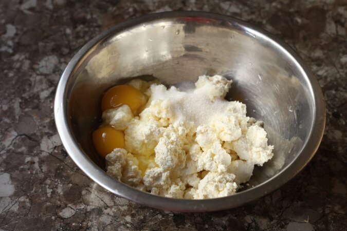 Umieść twaróg w misce, dodaj do niego jajka, cukier i, jeśli chcesz, wanilinę. Ważne jest, aby twaróg nie był zbyt mokry, wtedy ciasto wchłopnie mniej mąki, a twarożniki wyjdą puszyste i smaczniejsze. Zawartość tłuszczu w twarogu - od 5%. Przecieramy widelcem lub tłuczkiem.