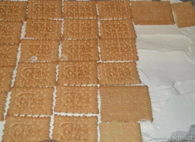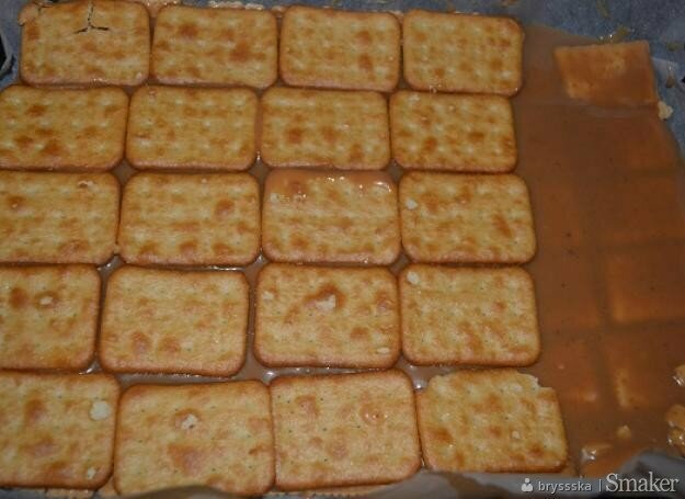 4. Ułożenie na blaszce herbatników oraz wylanie na nie ciepłej masy kajmakowej.