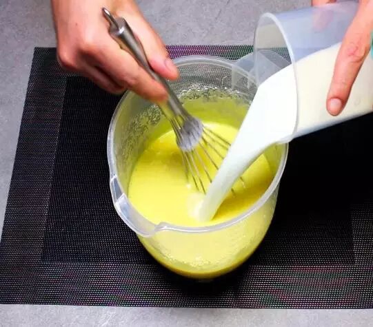 Następnie wlej mleko i dokładnie wymieszaj. W rezultacie powinnaś otrzymać ciasto jak na naleśniki.