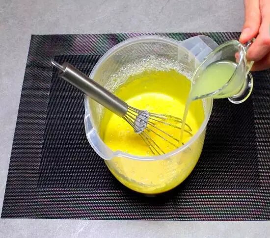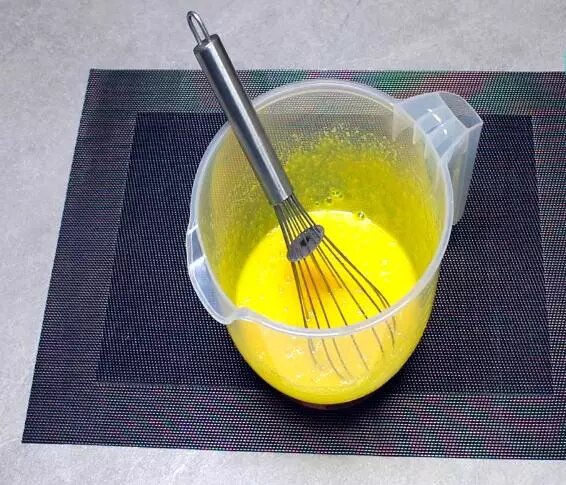 Jajka rozbij do głębokiej miski, dodaj cukier i dobrze wymieszaj trzepaczką przez kilka minut.
