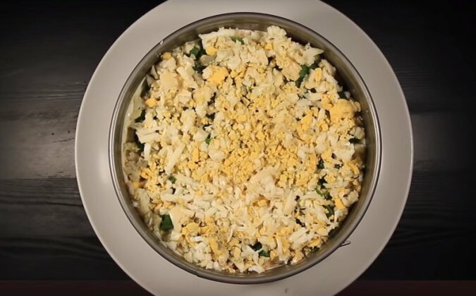 Wierzch posyp posiekanym koprem i grubo startym serem. Prosta sałatka z wędzonym kurczakiem jest gotowa, teraz wstaw ją do lodówki na kilka godzin, najlepiej na noc, aby sałatka była odpowiednio nasycona.