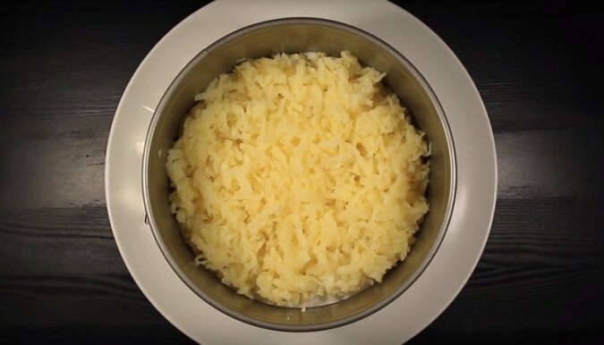 Pierścień do serwowania połóż na szerokim talerzu. Następnie obierz ziemniaki i zetrzyj na grubej tarce, a puree połóż jako pierwszą warstwę do pierścienia. Nasmaruj pierwszą warstwę majonezem.