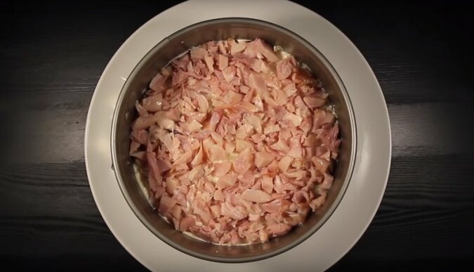 Usuń skórkę z udek i oddziel mięso od kości. Mięso pokrój na małe kawałki i umieść jako drugą warstwę w pierścieniu do serwowania. Aby danie było mniej kaloryczne, niektórzy używają gotowanego kurczaka.