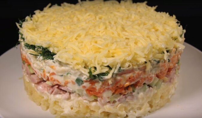 Ugotowaną marchewkę obierz i drobno zetrzyj bezpośrednio do pierścienia na warstwie ogórka. Nasmaruj całość majonezem. Nawiasem mówiąc, jeśli lubisz ostre sałatki, tutaj możesz również zastąpić gotowaną marchewkę marchewką po koreańsku - to jedna z opcji przygotowania sałatki.