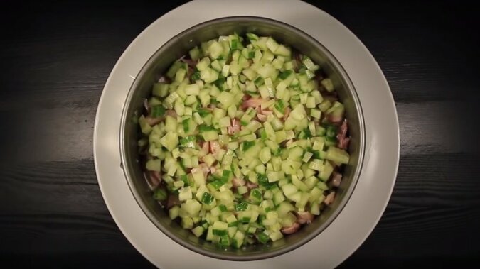 Zamiast pierścienia do serwowania możesz użyć wyciętej części z butelki lub ułożyć sałatkę warstwami w przezroczystej misce, aby uzyskać ładny wygląd. Jeśli przygotowujesz sałatkę dla swojego mężczyzny, nie musisz martwić się o to jak będzie wyglądała sałatka, bo ta zbyt smaczna sałatka zniknie w ciągu kilku minut, a na twarzy ukochanej osoby pojawi się zadowolenie i uśmiech.