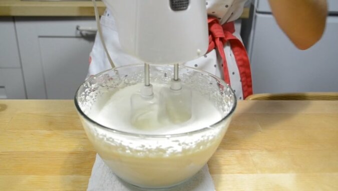 W misce wymieszaj twaróg, śmietanę i cukier. Wlej rozpuszczoną żelatynę cienkim strumieniem i ponownie ubij blenderem. Nie trzeba ubijać przez długi czas, ponieważ masa bardzo szybko się zespoli.
