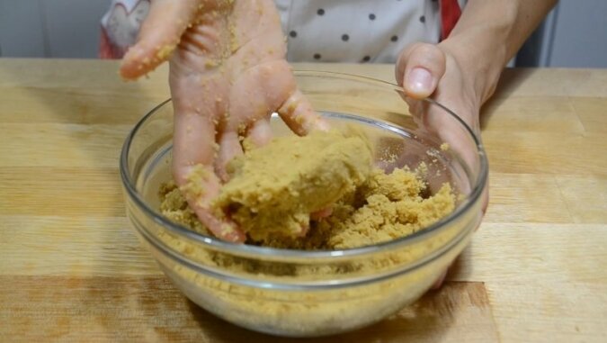 Roztop masło i lekko ostudź. Dodaj otrzymane wcześniej okruchy ciasteczek i dokładnie wymieszaj. Masa powinna być wilgotna i przy ściskaniu ręką zachować swój kształt.