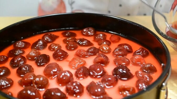 Gdy masa będzie już gotowa, wyjmij formę z lodówki i ułóż całe wiśnie na wierzchu tworząc okręgi. Przygotuj galaretkę wiśniową zgodnie ze wskazówkami na opakowaniu. Wiśnie zalać ciepłą galaretką i ponownie wstawić ciasto do lodówki, aż wszystkie warstwy się zespolą.
