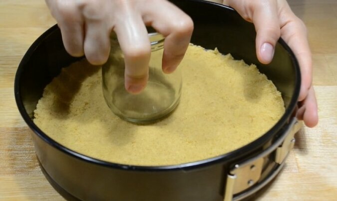 Dno rozsuwanej formy przykryj papierem do pieczenia, przełóż masę ciasteczkową i „ubij” ją bardzo mocno, aby uzyskać spód. Wstaw formę do lodówki i zacznij przygotowywać nadzienie.