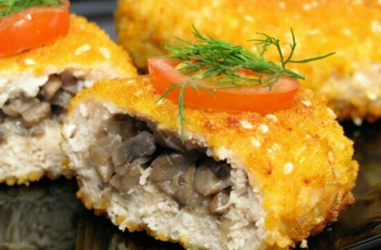 Wieprzowinę (możesz zamienić na pierś kurczaka) rozbij jak na kotlety. Mięso posól i popieprz do smaku. Na każdym kotlecie połóż łyżkę nadzienia.