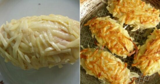 Panieruj każdego kotleta najpierw w jajku, mące a na koniec w ziemniakach. Smaż kotlety na złoto.