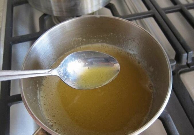 Przelej płyn z puszki z brzoskwiniami do miski. Do syropu dodaj żelatynę i pozostaw na kilka minut, aby spęczniało. Następnie podgrzej mieszaninę w łaźni wodnej, aż żelatyna całkowicie się rozpuści.