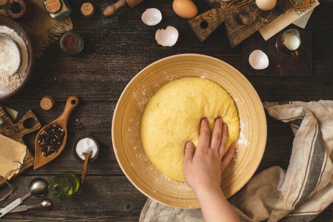 3. Zanim masło całkowicie się rozpuści, musimy szybko zagnieść ciasto. Następnie oddzielamy od niego jedną trzecią, którą później użyjemy do przykrycia nadzienia. Następnie wstawiamy obie części do lodówki.