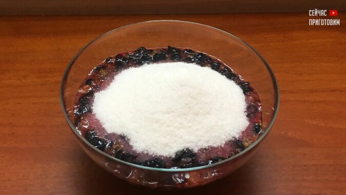 Wsypać cukier do pojemnika z czarną porzeczką. Nie zapomnij zostawić 100 gramów cukru, będziemy go później potrzebować. Całość dokładnie wymieszaj drewnianą szpatułką, aż cukier całkowicie się rozpuści.