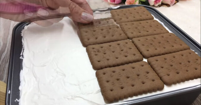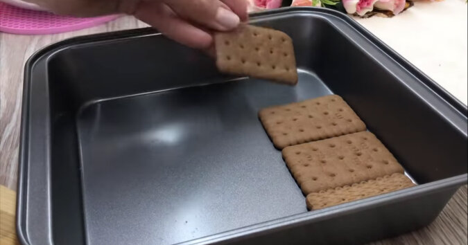 Teraz musimy wziąć dowolną formę (mam 23x25cm) i ułożyć ciasteczka na dnie. Przekładamy nasze lody i delikatnie rozprowadzamy za pomocą szpatułki, a wierzch przykrywamy ciasteczkami. Zostawiamy w zamrażarce na noc.