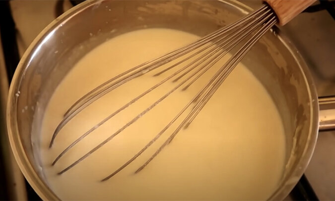 Masło roztop w rondelku, następnie dodaj mąkę, wszystko ubij za pomocą trzepaczki i wlej mleko.