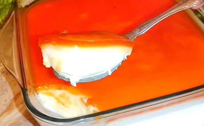 Wymieszaj skrobię kukurydzianą z wodą. Wsyp cukier na patelnię i roztop na karmel, następnie dodaj skrobię i wodę. Gotuj, aż karmel zgęstnieje. Wyciągamy formę z kremem, polewamy karmelem i deser jest gotowy.