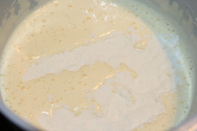 3. Przygotuj drugą warstwę: połącz jajka z cukrem (zostaw do całkowitego rozpuszczenia - 10-15 minut), dodaj mąkę i delikatnie wymieszaj łyżką od dołu do góry.