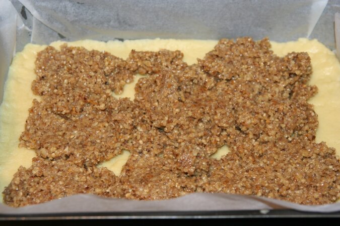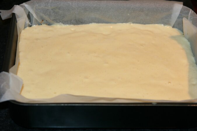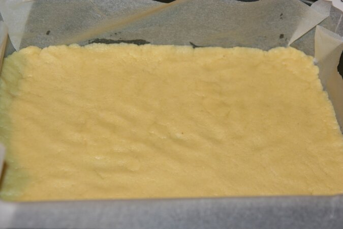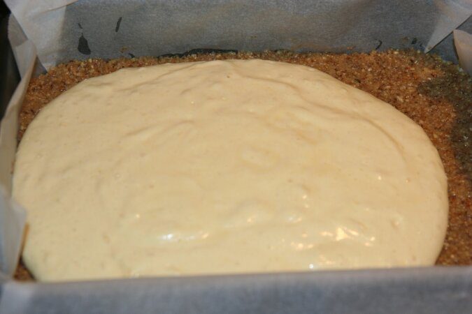 6. Drugi rodzaj ciasta wylewamy na nadzienie i wkładamy do piekarnika na 25 minut. Czy deser jest gotowy sprawdzamy za pomocą wykałaczki.