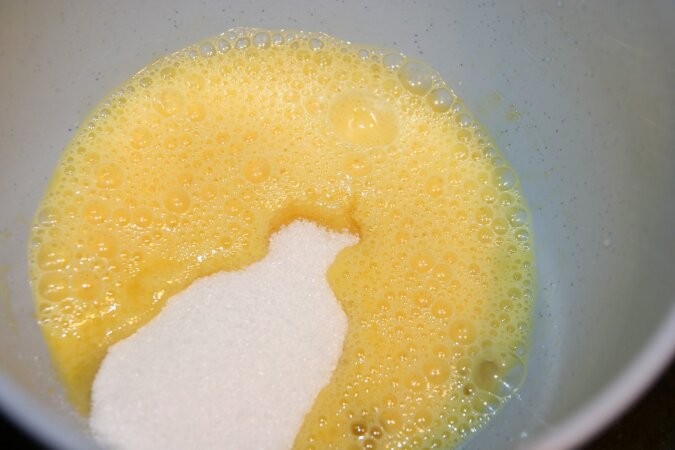Dodaj cukier i wymieszaj, następnie dodaj żółtko i ponownie mieszaj przez 5 minut.