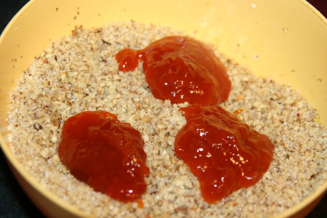Wymieszaj zmielone orzechy z cukrem, rumem, mlekiem i dżemem morelowym do uzyskania jednolitej konsystencji i zostaw.