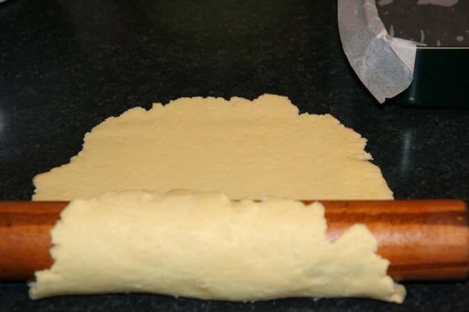 4. Wysmarowaną masłem formę wyłóż papierem do pieczenia, ciasto rozwałkuj na stole i za pomocą wałka przełóż do przygotowanej formy (mam formę o średnicy 20×30 cm).