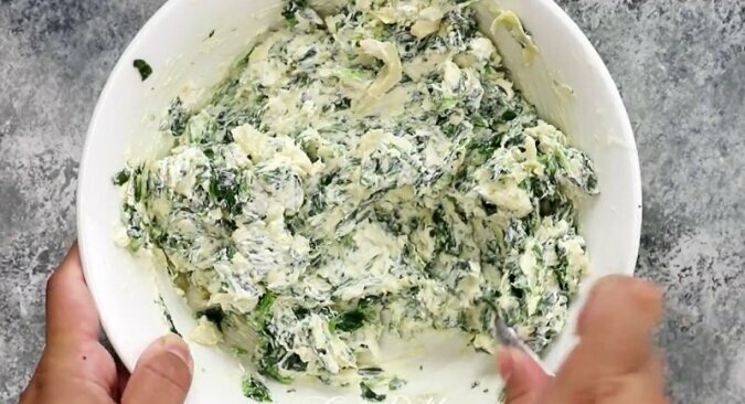 W głębokiej misce wymieszaj twarożek, świeży szpinak, tartą cukinię oraz ser. Dodaj do mieszanki 1/2 łyżeczki soli.