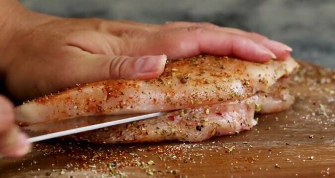 Wykonaj nacięcie wzdłużne na każdej połowie piersi z kurczaka.